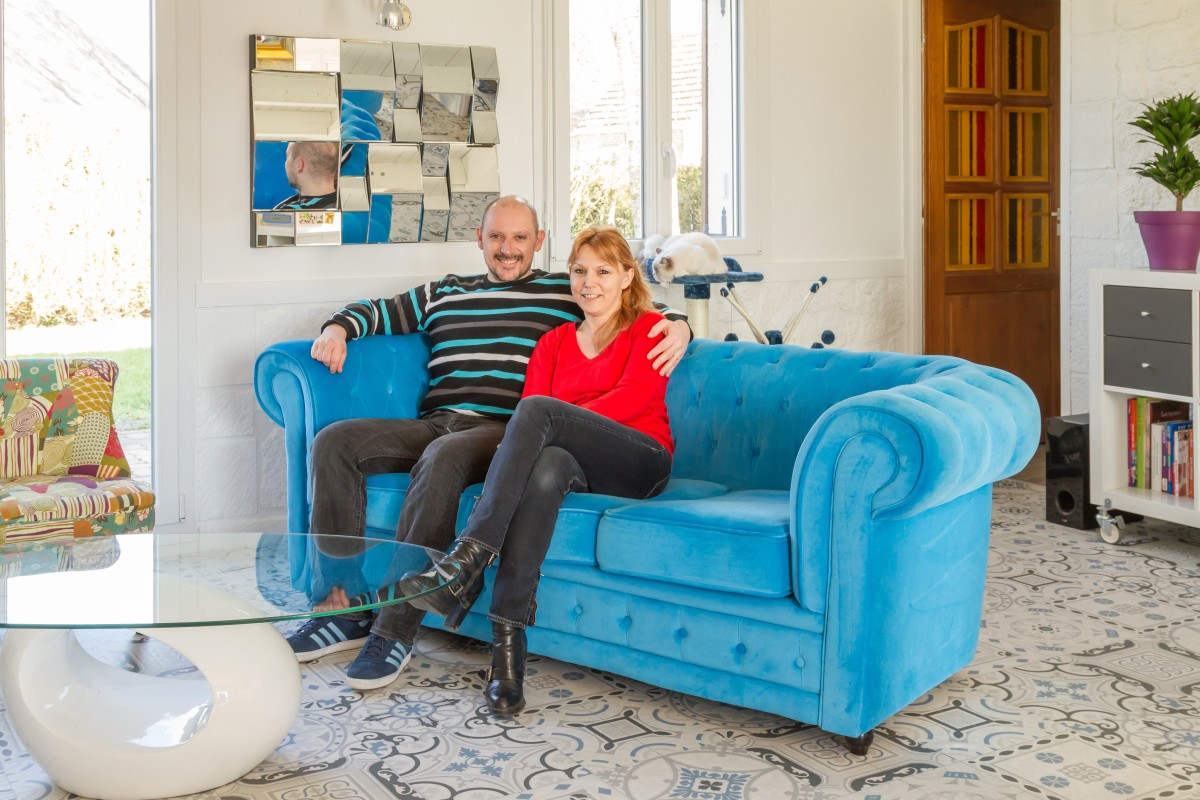 Initialement, Sébastien et sa femme souhaitaient pour leur sol une couleur claire, plutôt blanche, mais avec des touches de couleur pour apporter une vraie touche déco dans les pièces à vivre (salon, séjour, couloir). Ayant une préférence initiale pour un sol bois, notamment pour un parquet, il a fallu prendre en compte un important point faible du carrelage posé auparavant: sa froideur. Pour conserver un maximum de chaleur au sol, sans remettre en cause l’esthétique, Benjamin, conseiller au magasin de Compiègne, les a orientés vers un sol vinyle. Pour le choix du modèle, il se devait de répondre à des critères de beauté très précis: « être ni trop gris, ni trop coloré, avoir des motifs ni trop gros, ni trop petits »