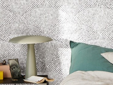 Un papier peint effet mosaïque associé à un rideau plus sombre offre une version cocoon chic à la deuxième chambre afin de conserver l’esprit autenthique de la maison Un tapis sur-mesure habille le dressing apportant moelleux et confort. Des tons grisés et marbrés donnent du style à cette pièce étroite.
