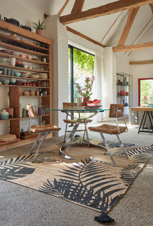 Un large tapis kilim au sol aux accents cyan et magenta joue pleinement le contraste et habille la pièce avec style .
