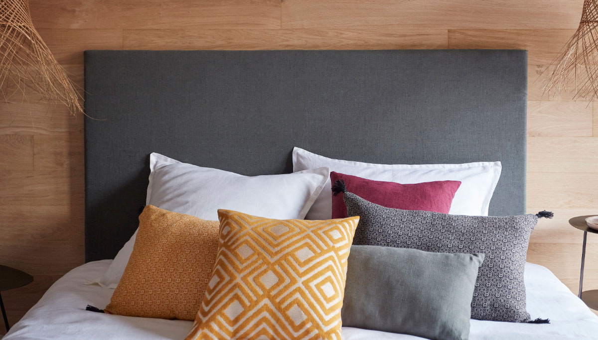 Nous avons souhaité adopter une décoration aux tons chauds, largement rehaussée par les tissus de confection choisis: du rouge, du jaune, des effets graphiques, afin de la rendre plus exotique et très lumineuse. Les équipes Saint Maclou nous ont conseillé de jouer la carte de la coordination jusqu’au bout : jeté de lit, tête de lit, rideaux, stores, coussins, tous les éléments textiles de la pièce ont été choisis et assortis. Désormais, notre chambre ne ressemble à aucune autre !